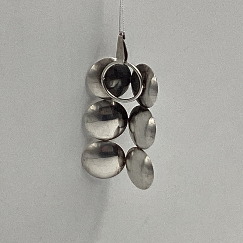 The geometric discs measure approximately 1.5 cm each, creating a sculptural pendant that measures 5.5 cm x 2.5 cm. Its smooth, reflective surfaces catch the light beautifully, giving the piece a dynamic and eye-catching look.