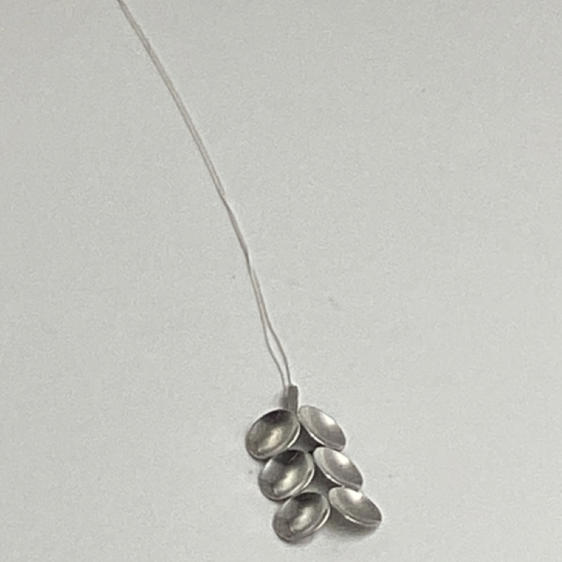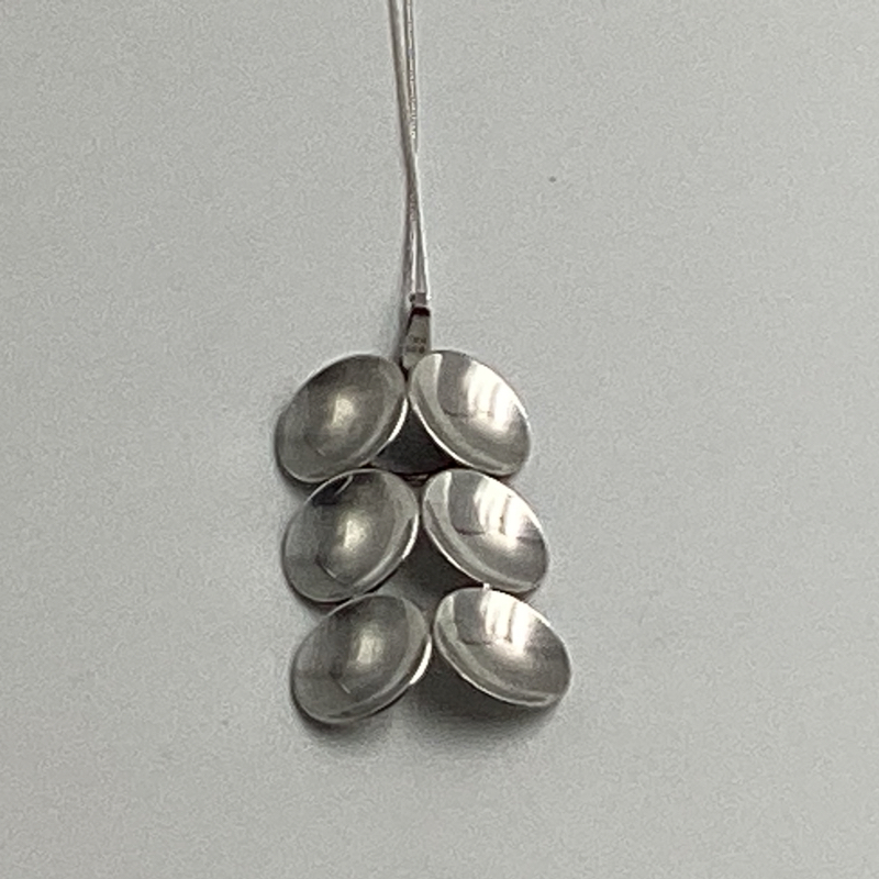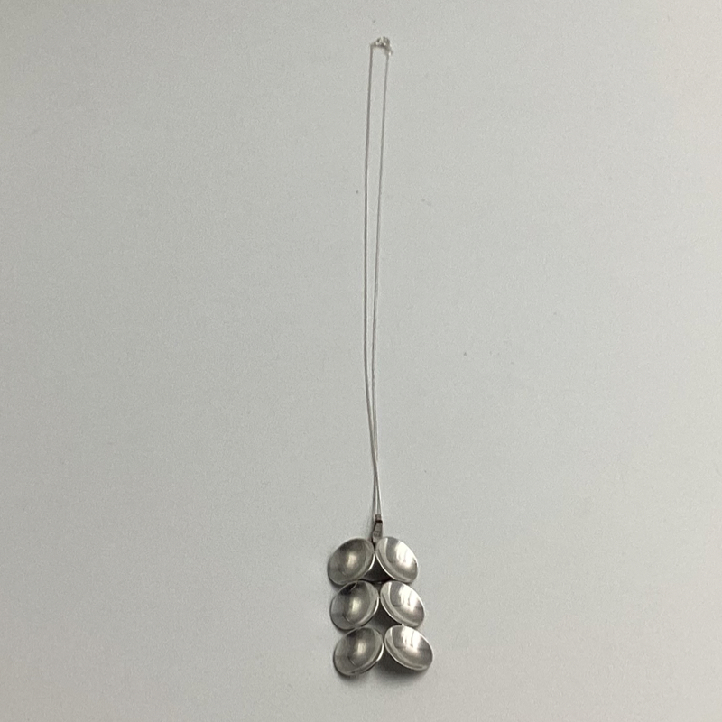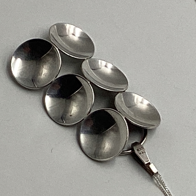 This iconic mid-century silver necklace from K&L Kordes Lichtenfels in Germany commands attention with its bold, abstract design. The pendant features six polished silver discs, each 1.5 cm in diameter, creating a striking mirrored effect. Measuring 5.5 cm by 2.5 cm, the pendant hangs elegantly from an 18-inch recycled Italian silver chain. A rare and eye-catching piece, this stunning necklace is a true statement of vintage craftsmanship, stamped with the mark “K&L 835,” making it a highly sought-after collectible.